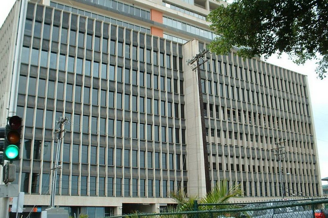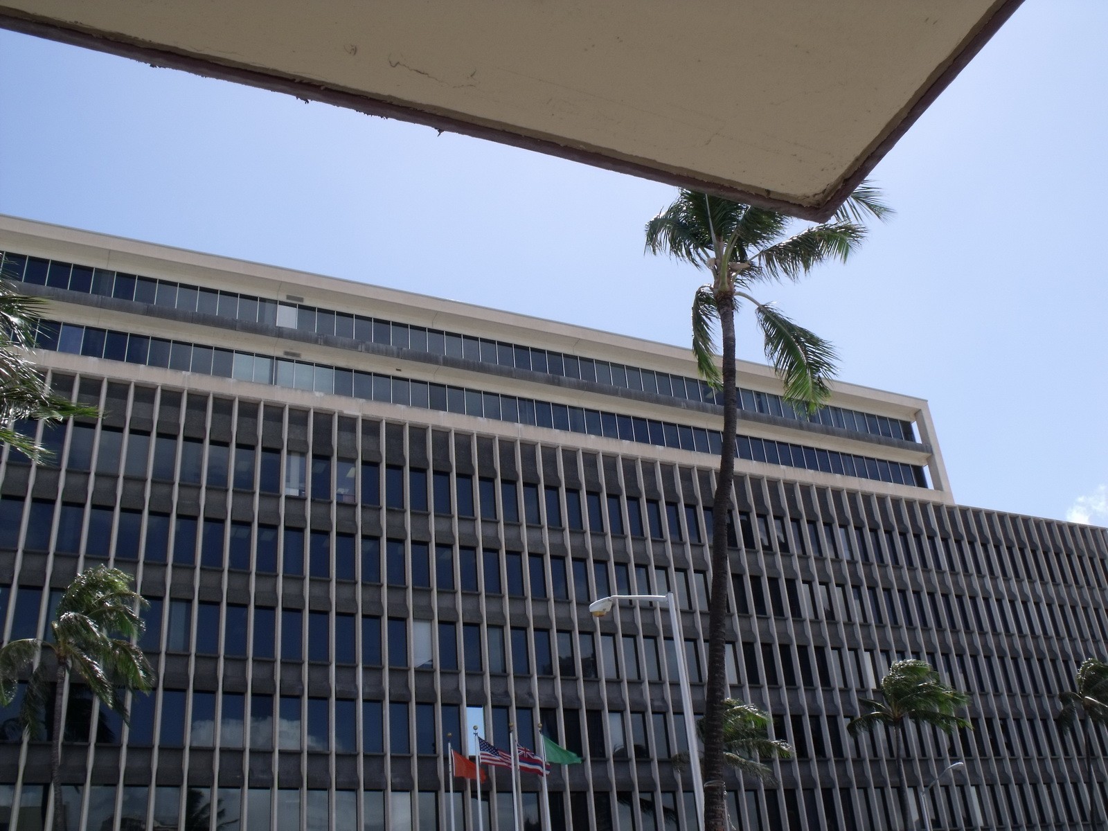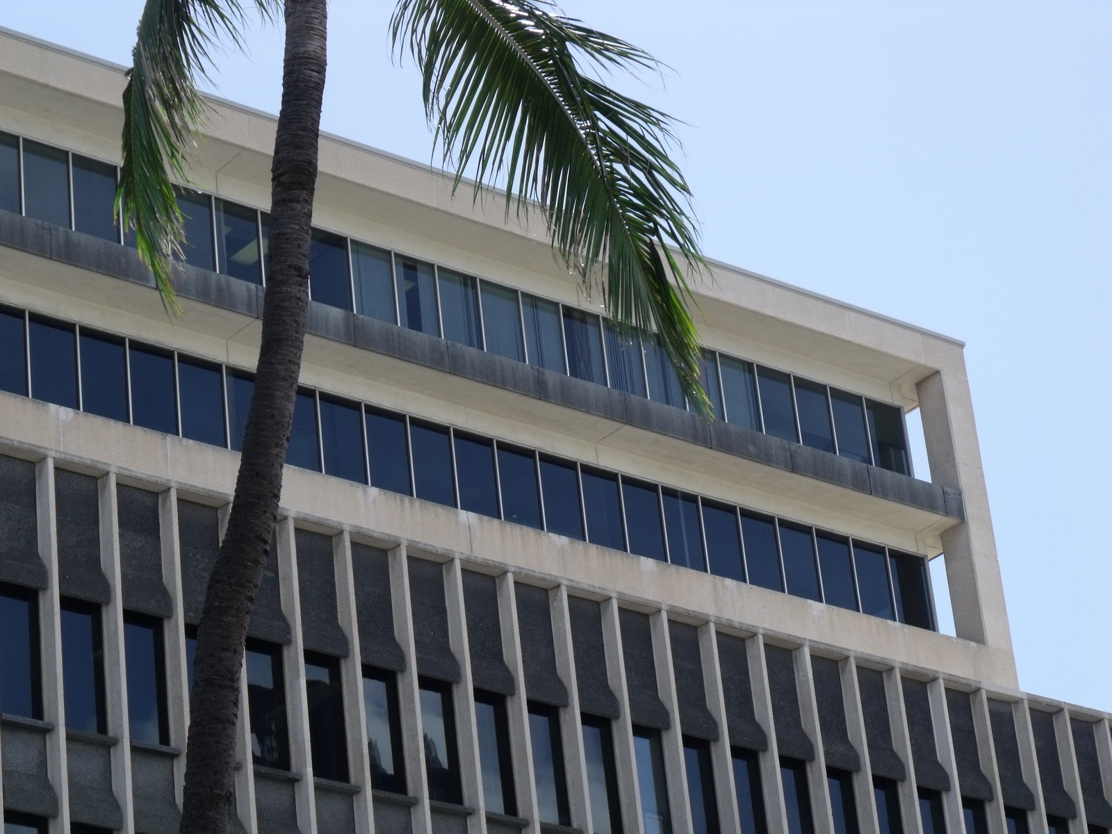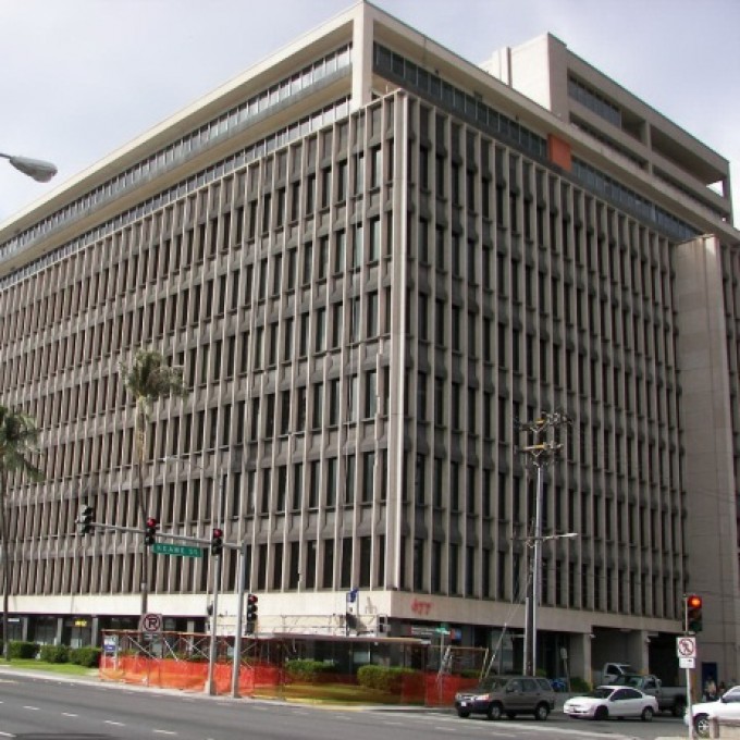 The building at 677 Ala Moana is a twelve-story structure that was constructed in multiple phases starting circa 1966 and completed circa 1971. The exterior walls are comprised of cast-in-place concrete with concrete masonry unit (CMU) infill walls, coated with paint at one elevation, and exposed aggregate precast panels and window walls at the remaining three elevations.