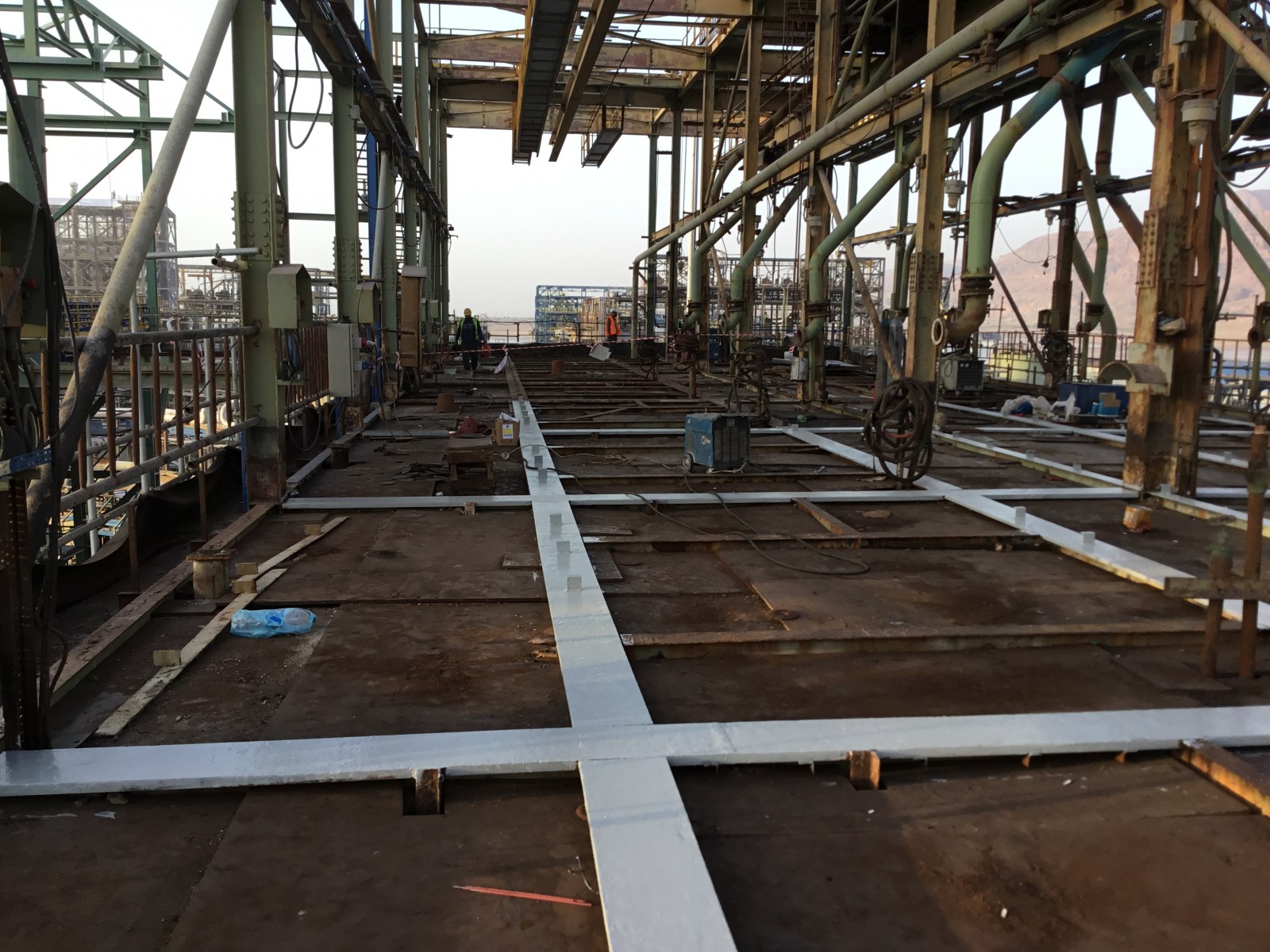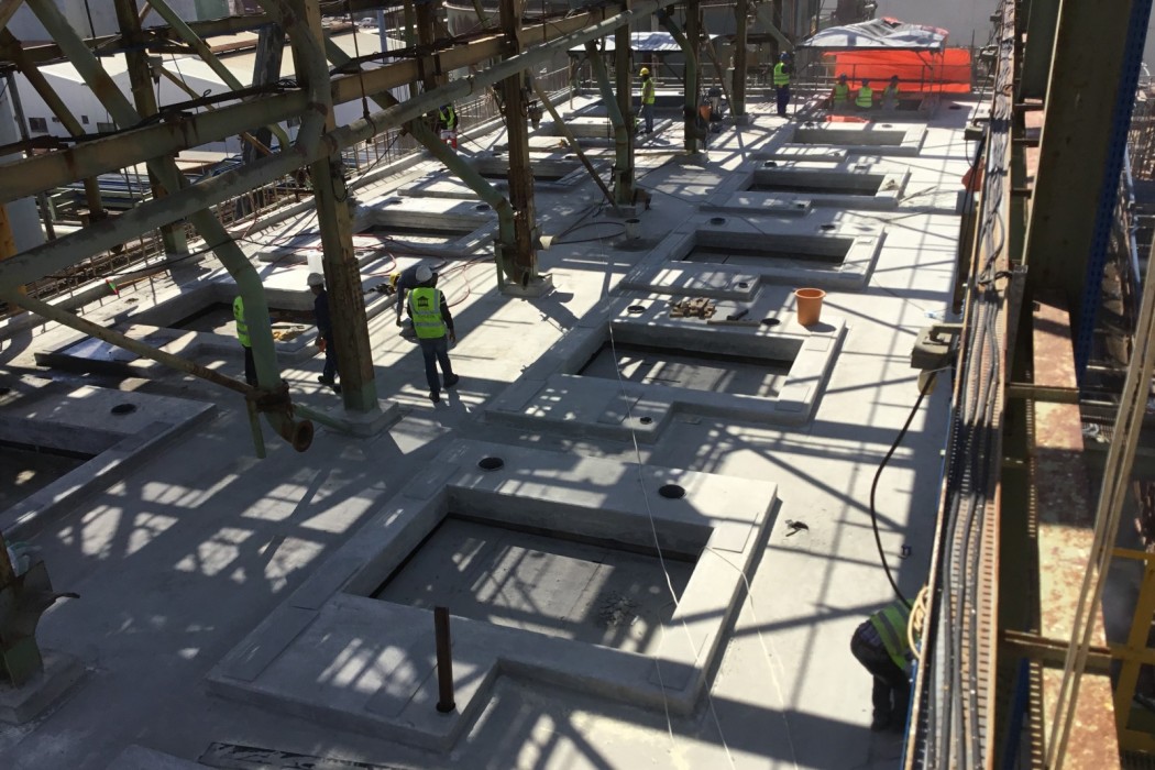 The new slab was reinforced with only glass fiber-reinforced polymer (GFRP) reinforcing bars. Although GFRP bars have been used in the past in structures exposed to chlorides, they had never been used in this application. Unlike steel bars, the GFRP bars exhibit nonductile fracture failures and are sensitive to low levels of sustained and cyclic loading. As such, WJE's design included an evaluation of these effects, including estimates of dynamic/cyclic loads from the operation of the centrifuge machines. The slab concrete was designed to be relatively impermeable, and included considerations for locally available materials. To prevent deterioration of the concrete surface paste, the slab design included topping with a resinous protective system. Exposed steel elements were cleaned and coated with a three-coat high-performance marine paint.