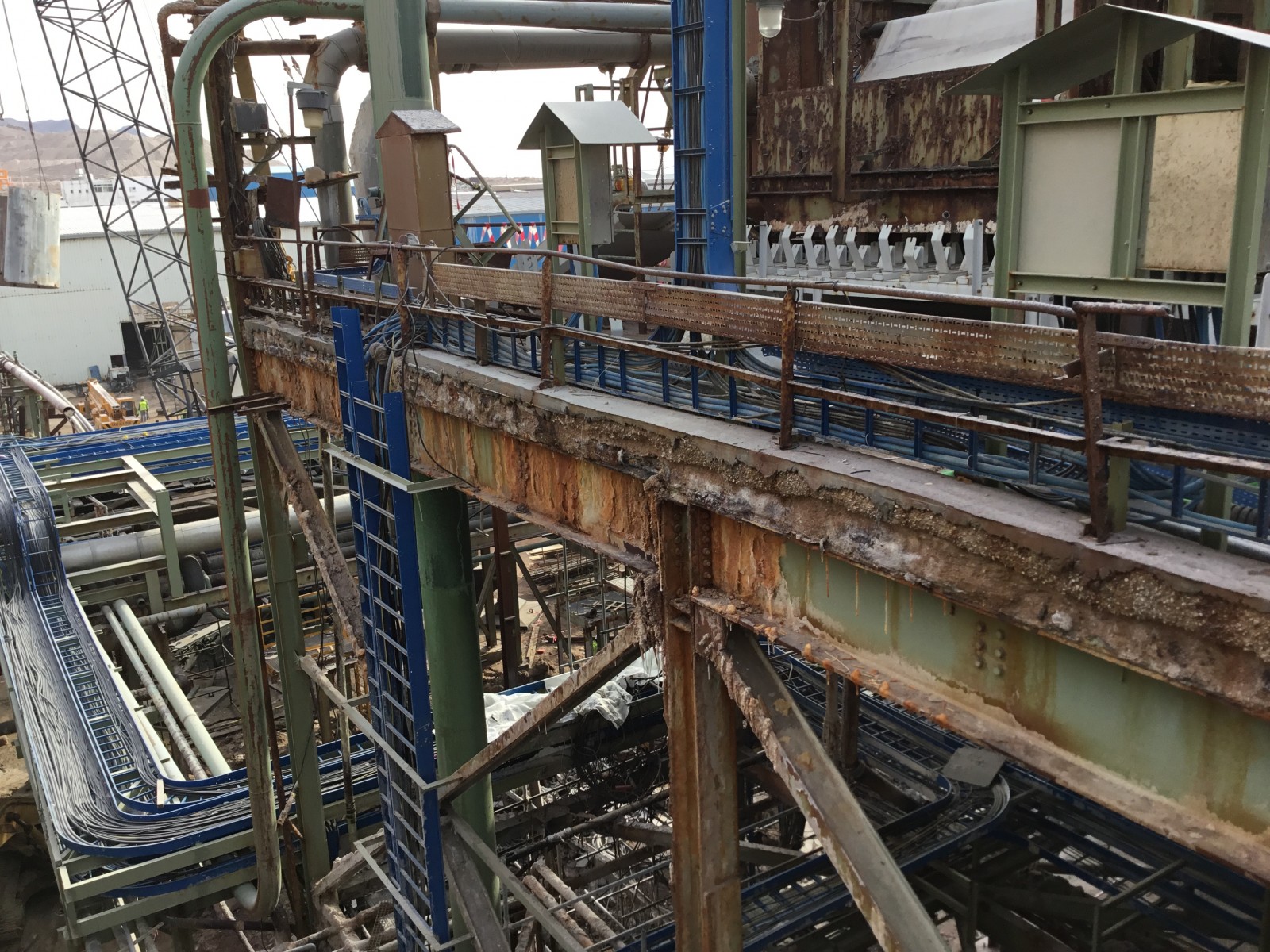 Long-term exposure to hot leach product (HLP) led to advanced deterioration of the concrete slab and supporting steel framing as well as deterioration of the concrete surface paste and corrosion of the embedded reinforcing steel. The supporting steel beams, columns, and bracing members exhibited advanced localized corrosion where the HLP product was allowed to pond. WJE was tasked with designing a replacement concrete slab capable of resisting the deleterious effects of the HLP while being able to support the dynamic loads from the centrifuge machines.