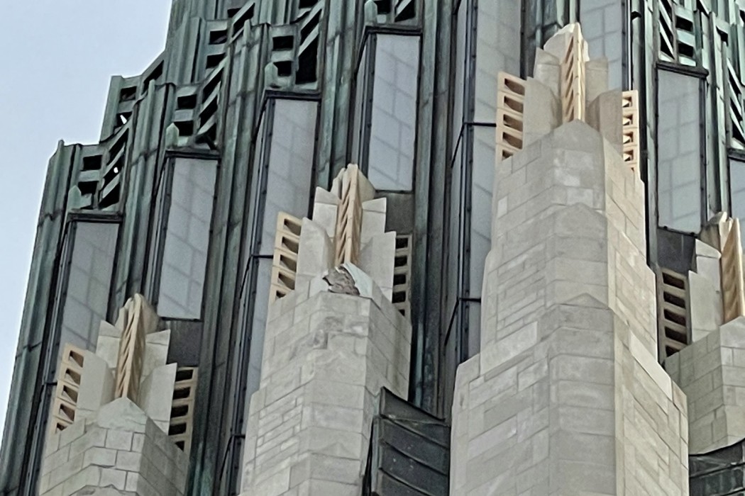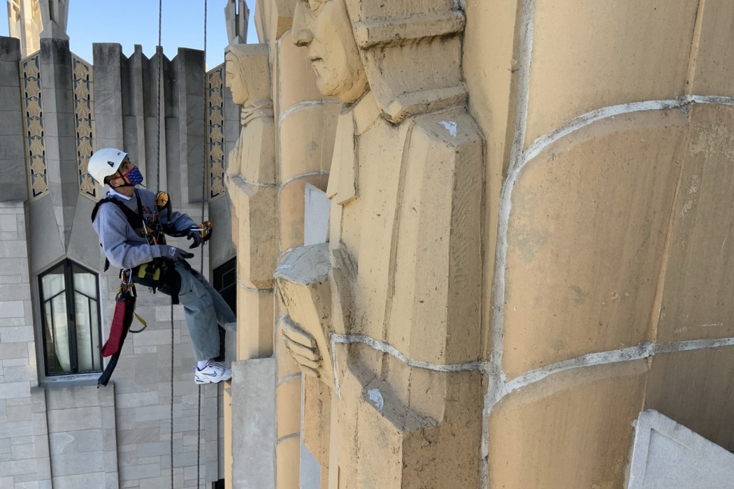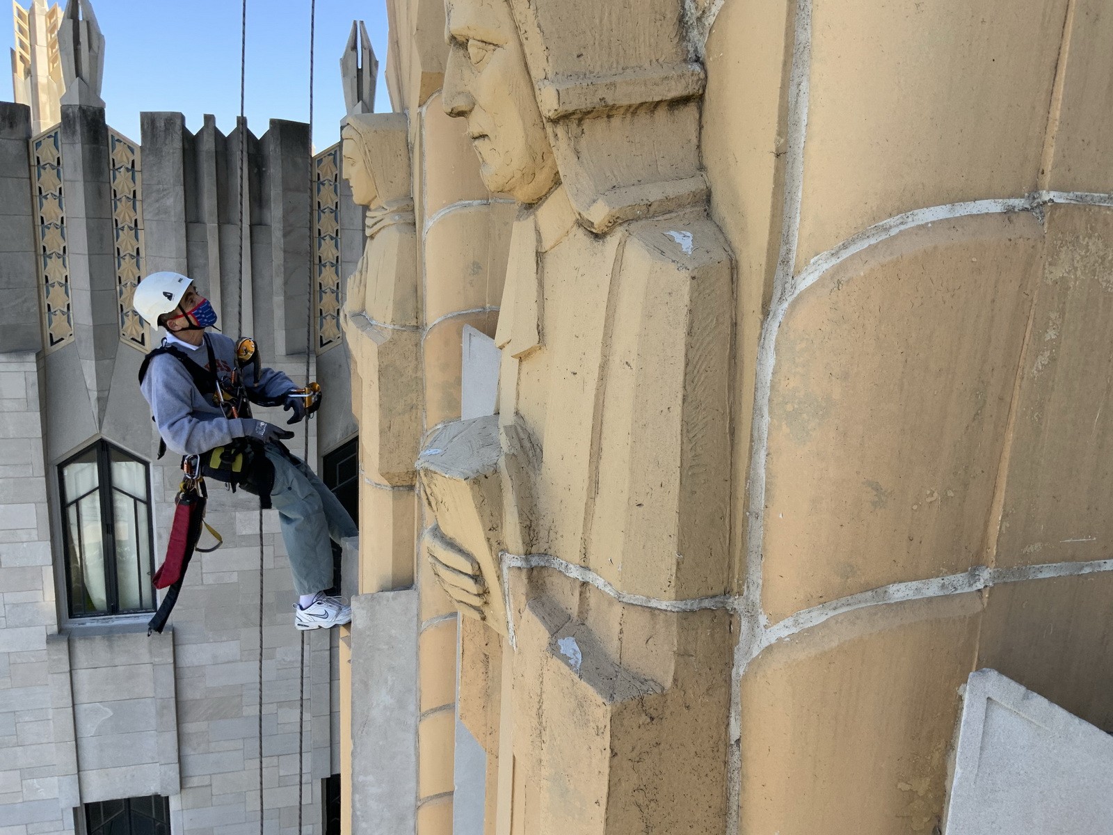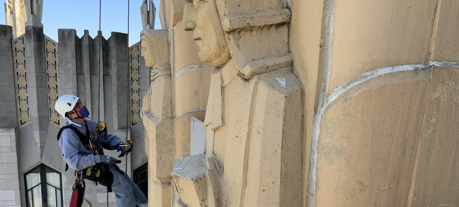 WJE performed a limited close-up inspection of the building facades using industrial rope access techniques to review the existing condition and as-built configuration of the tower. The WJE team observed interior moisture exposure and damage, and reviewed the exterior limestone and terra cotta, sheet copper cladding, and window and roof systems.
