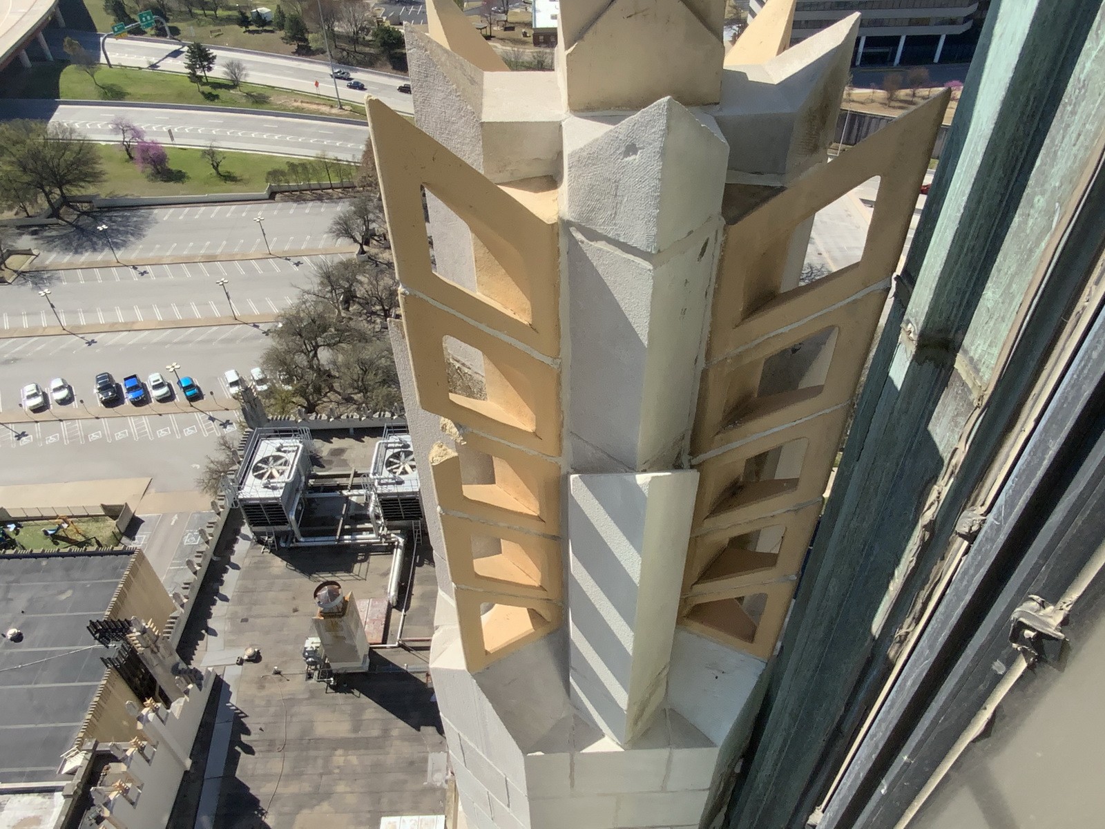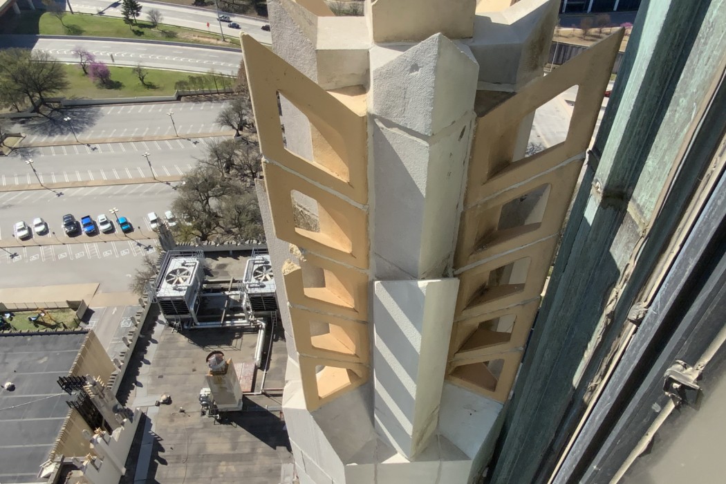 During a site meeting, water infiltration issues and various conditions were discussed, including the general condition of the stone relative to distress and staining. After a recommendation that the issues be further investigated, Boston Avenue United Methodist Church (BAUMC)  requested a proposal to visually examine up to eight areas of the facade of the tower using WJE’s Difficult Access Team.