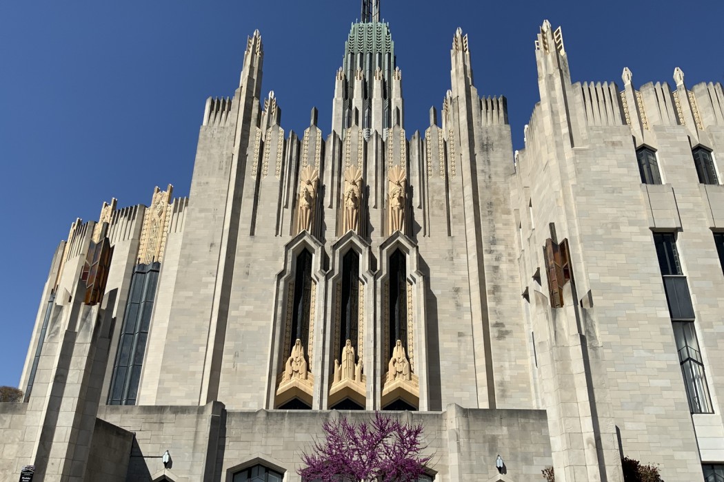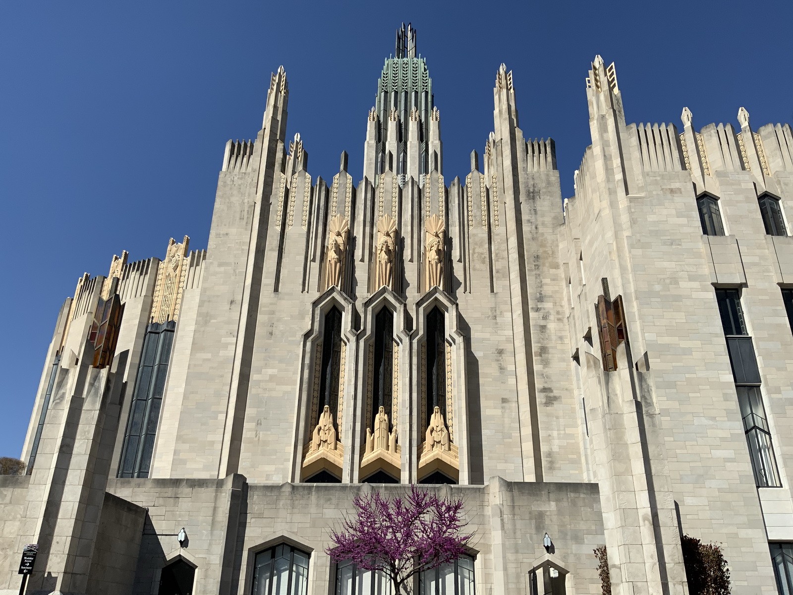 BAYMC was constructed between 1927 and 1929 in downtown Tulsa, Oklahoma. The building was designed by Bruce Goff and Adah Robinson in the Art Deco or Modern Gothic style. The exterior of the church has been largely architecturally unaltered since construction. The structure consists of a semicircular auditorium and a prominent 250-foot-tall, fifteen-story central tower. The exterior facade is primarily clad in Bedford (Indiana) limestone and contains terra cotta and copper ornamentation. The aluminum-framed windows are glazed with plate glass lites.