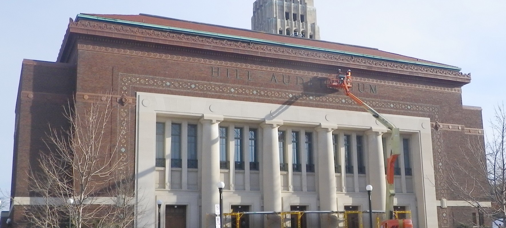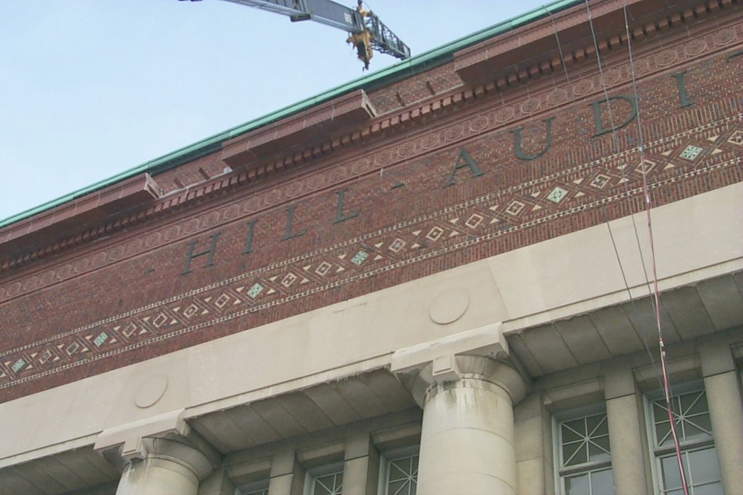 First opening its doors in 1913 and originally designed by Albert Kahn, Hill Auditorium is rectangular in plan with approximate overall measurements of 143 feet in the east-west direction by 119 feet in the north-south direction. The 17-inch thick exterior walls primarily consist of multi-wythe clay brick masonry with various accent features of limestone and terra cotta. One predominant feature located approximately 165 feet above grade is the ornate, multi-coursed, cantilevered, terra cotta cornice assembly.