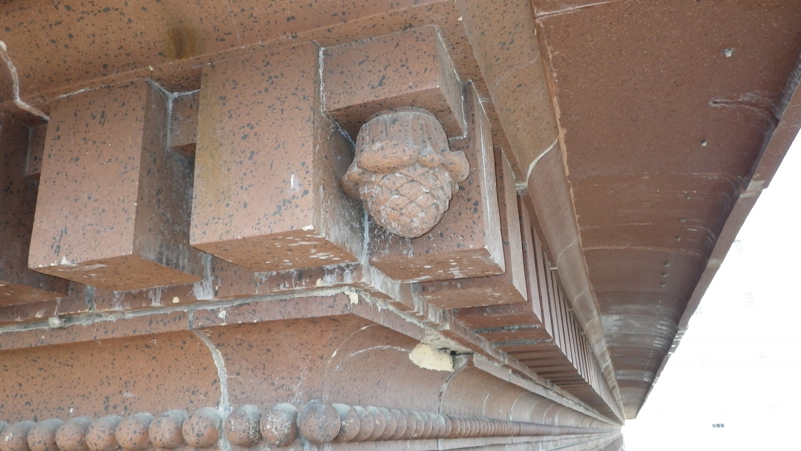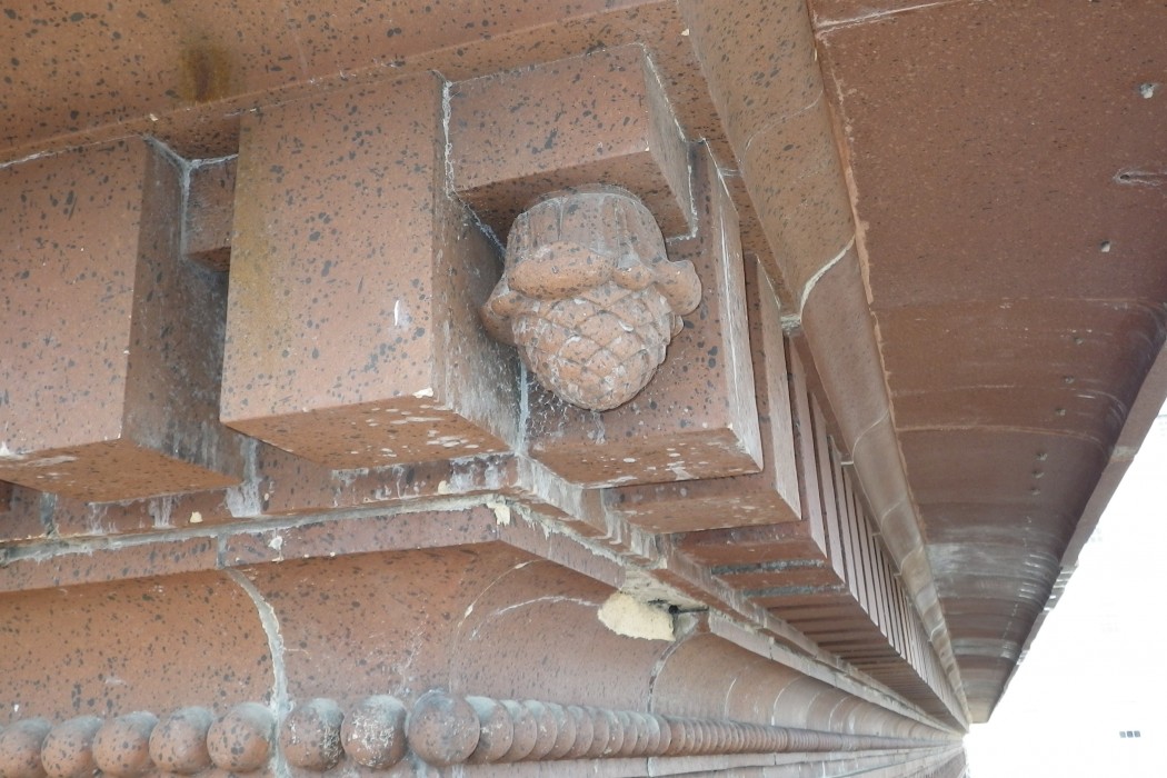 WJE performed an up-close visual survey of the terra cotta cornice and associated roof drainage elements above the main entrance of the building from grade, roof level, and from aerial lift. Based on our assessment, it was determined that the terra cotta units were in serviceable condition; however, accelerated deterioration had occurred from years of in-service exposure and water infiltration through the roofing system atop the cornice.