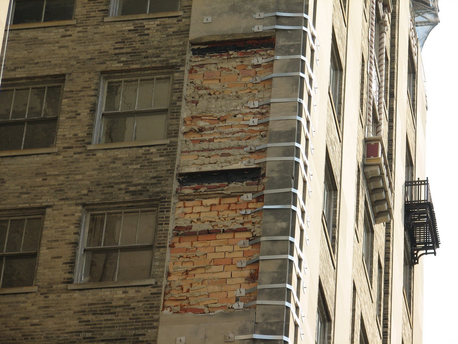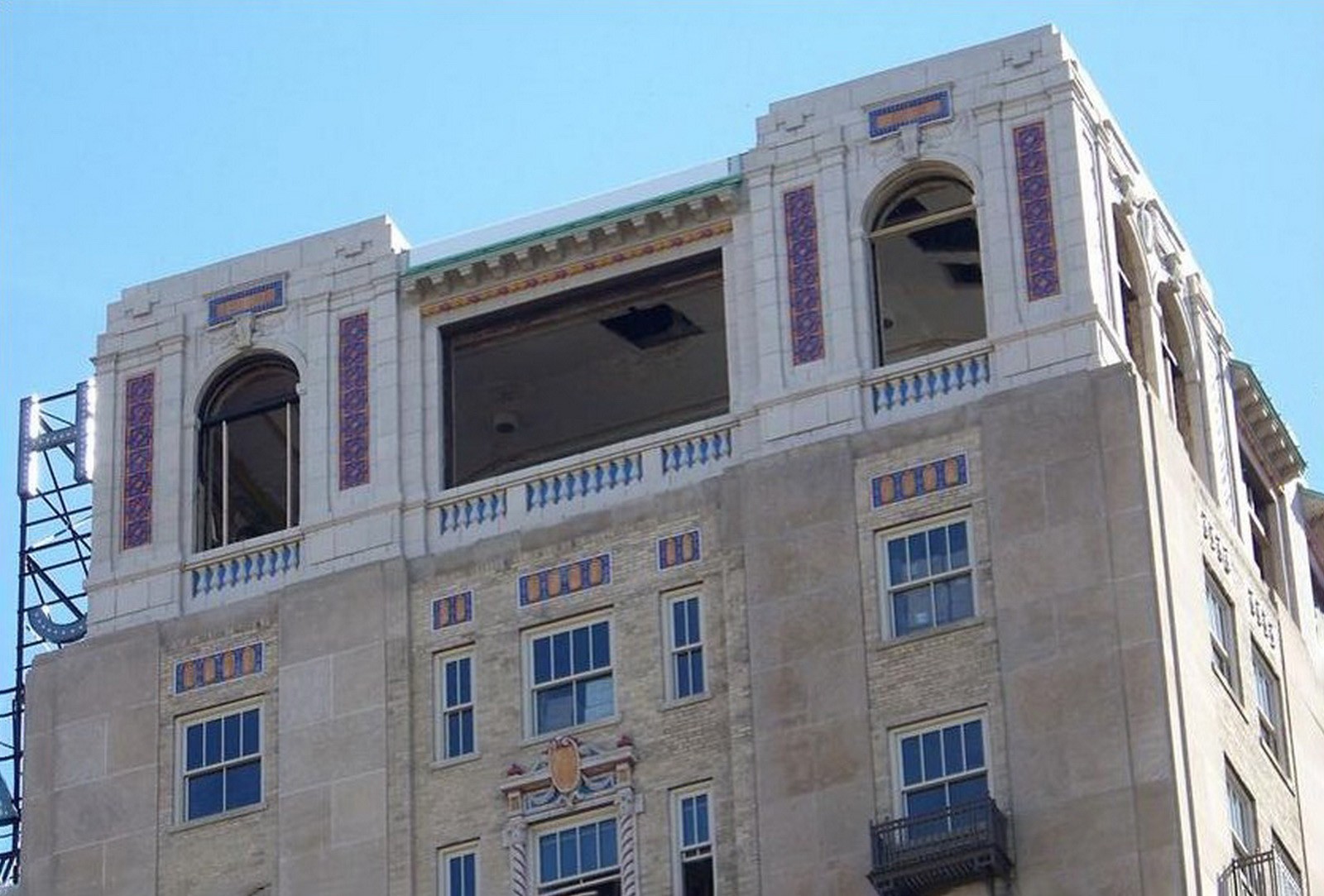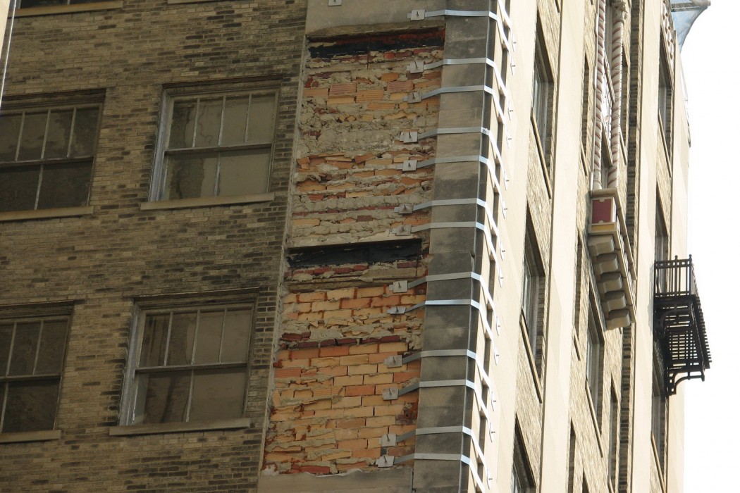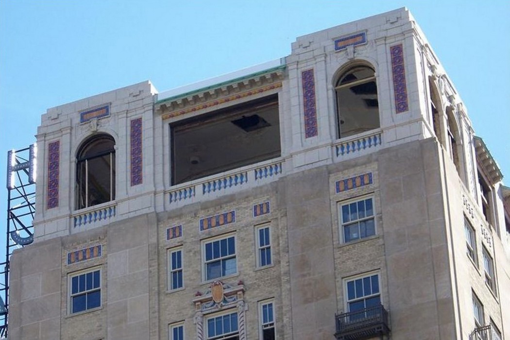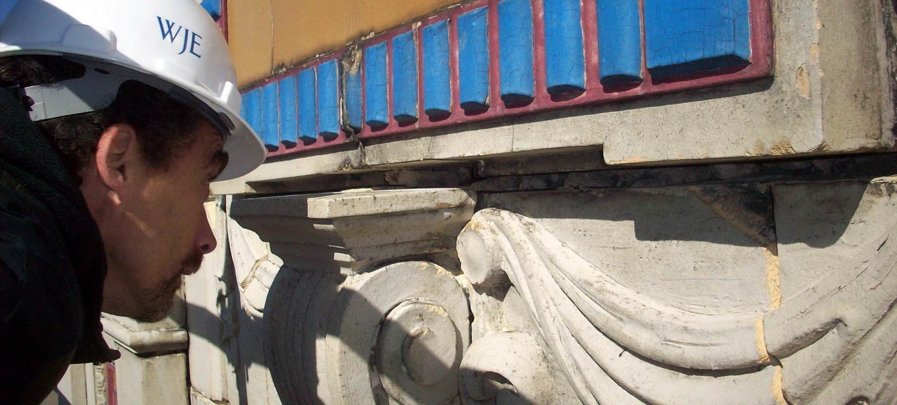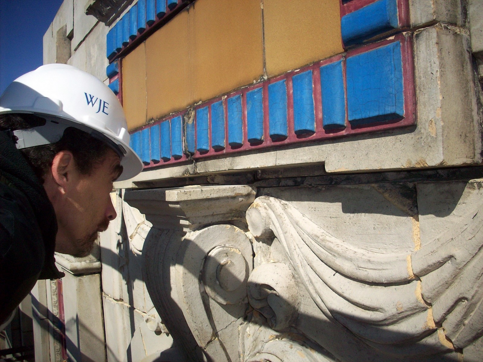 The originally proposed limestone panel repair design posed scheduling challenges within a tight construction timeline and failed to meet historic tax credit criteria. Rather than installing bolts through the limestone and terra cotta back-up and into steel framing at the interior, the final repair approach reintegrated the limestone and the terra cotta back-up from only the exterior, using adhesive anchors to secure the limestone to the terra cotta back-up, which maintained the original load path and minimized the need for supplemental strengthening of systems that were not originally designed to carry limestone cladding loads. Through-face adhesive anchors were designed based on test data and load analysis and were used at virtually all limestone panel configurations due to the potential that the existing anchors were corroded and no longer functioning. Every limestone panel was stabilized from the exterior with no need to perform work at the interior, allowing the interior restoration efforts to go forward unimpeded. Additional repairs included full restoration of the polychromatic terra cotta and replacement of unstable brick masonry.