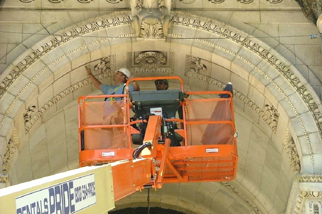 A century of exposure to acid rain, diesel exhaust, and pigeon guano had left the exterior of the New York Public Library (NYPL) in need of extensive restoration. The building's carved marble architectural elements and fine art sculptures were deteriorated, the Tiffany bronze windows and grilles were oxidized, the roofs were damaged, and the brilliant white Vermont marble facade had lost its sparkle. WJE was selected to design and oversee cleaning and repairs of the library in anticipation of the building's 100th anniversary celebrations.