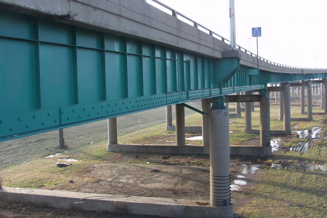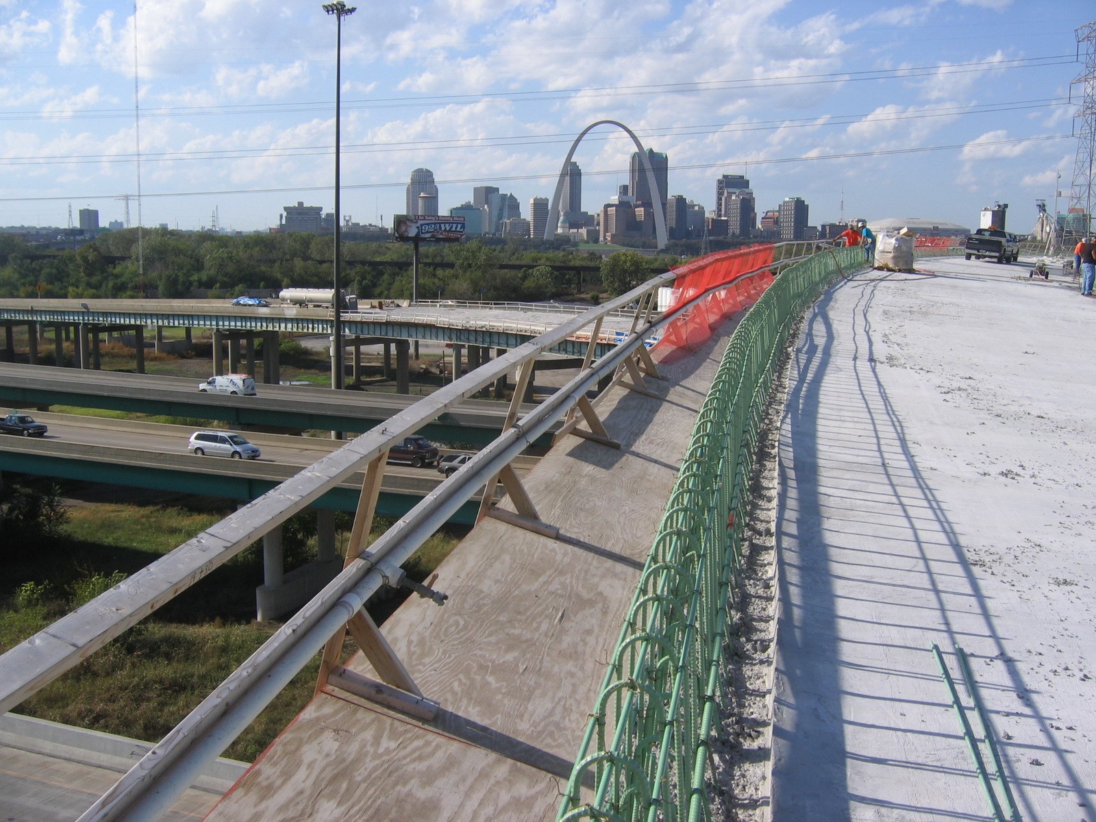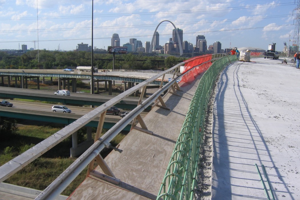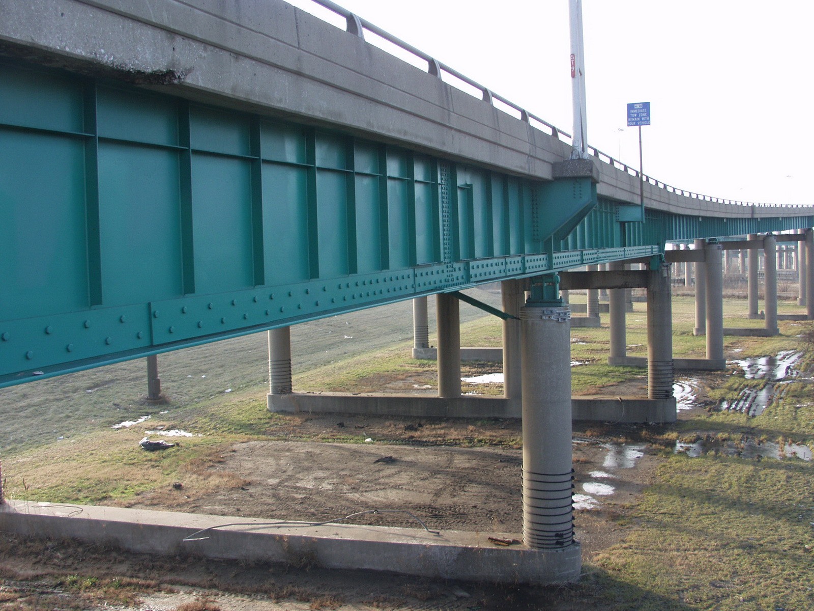 A system of elevated roadways connects the Poplar Street Bridge to several local, state, and interstate roads on the Illinois side of the Mississippi River. Built in the late 1960s, the elevated roadways feature concrete decks supported by steel beams and plate girders. Reinforced concrete columns founded on steel piles support the plate girders.
