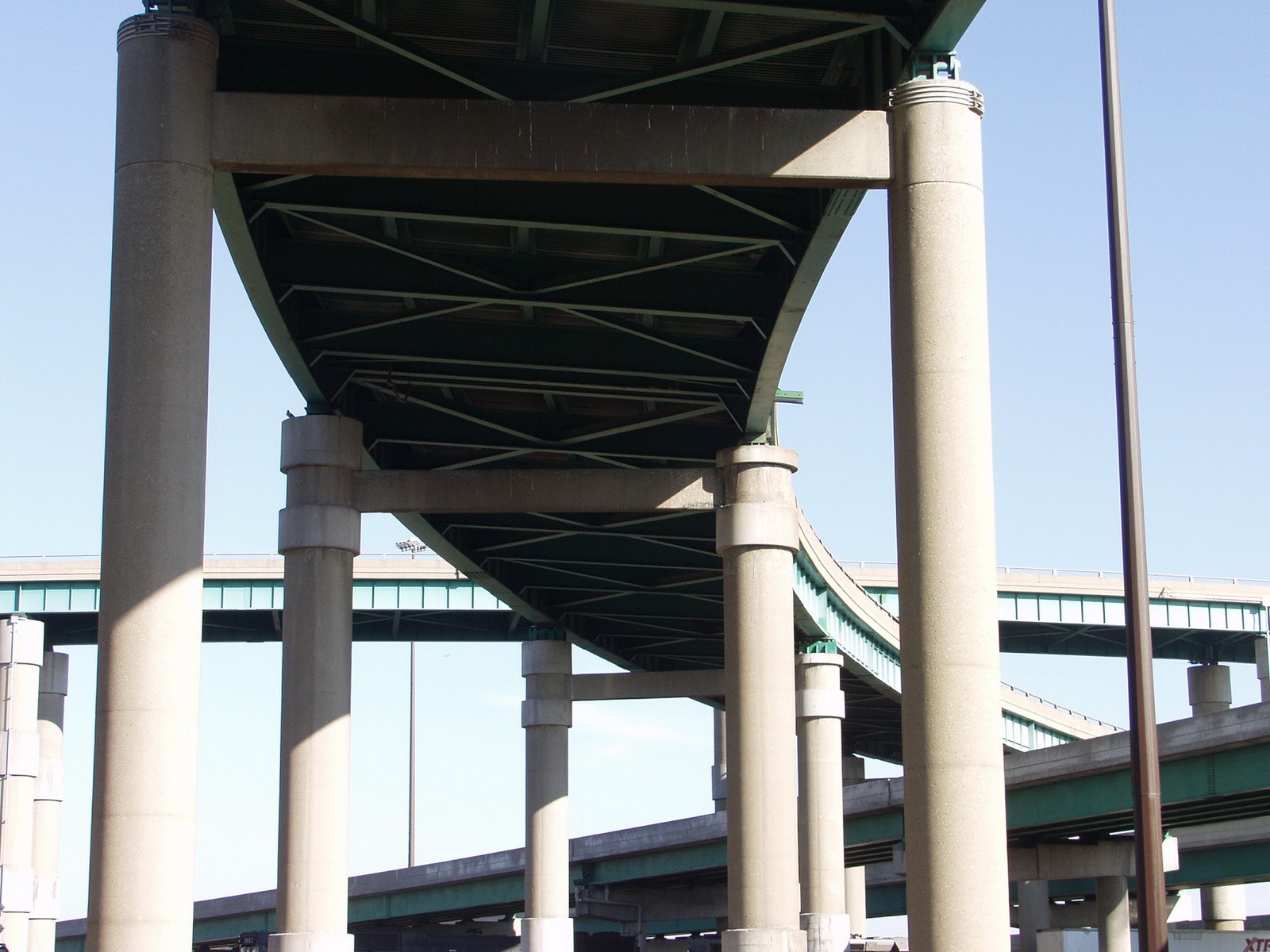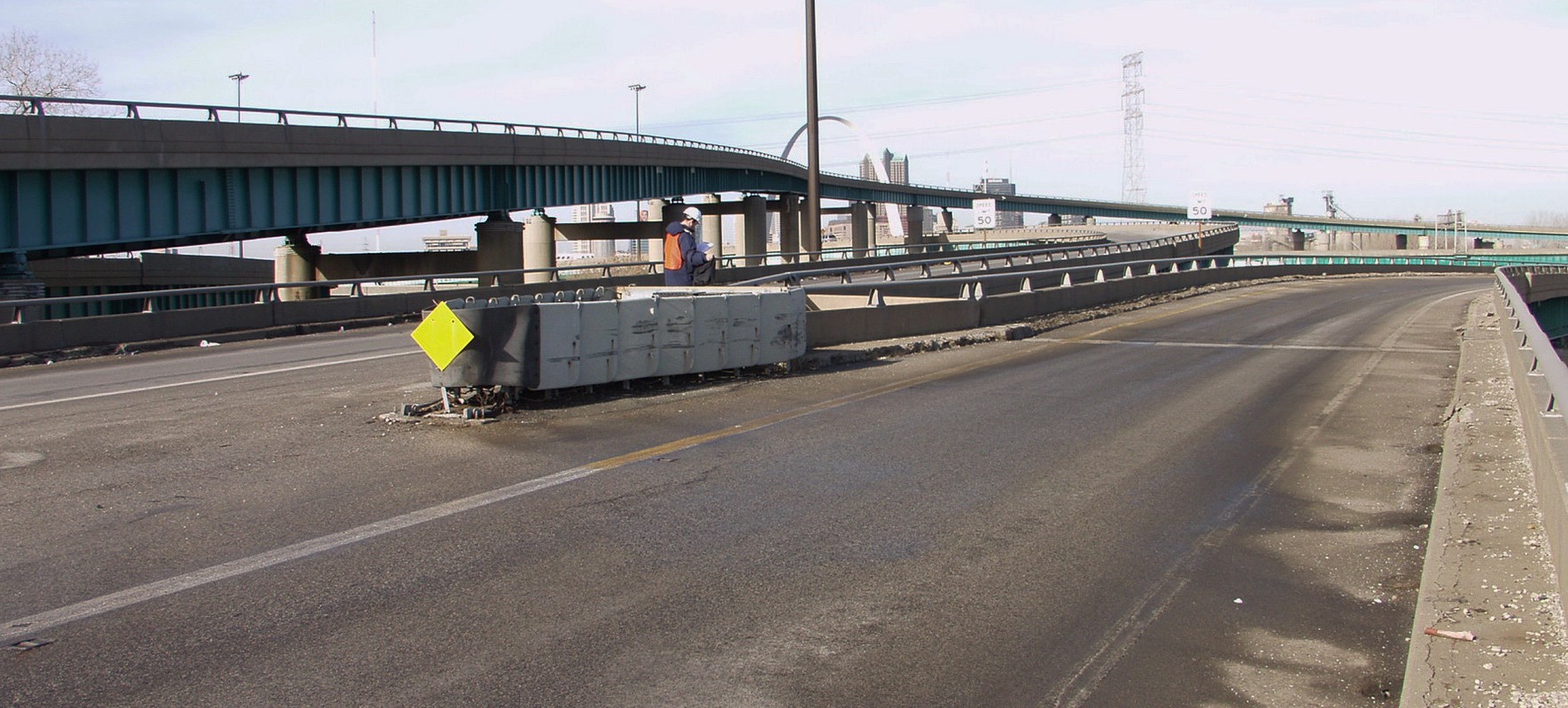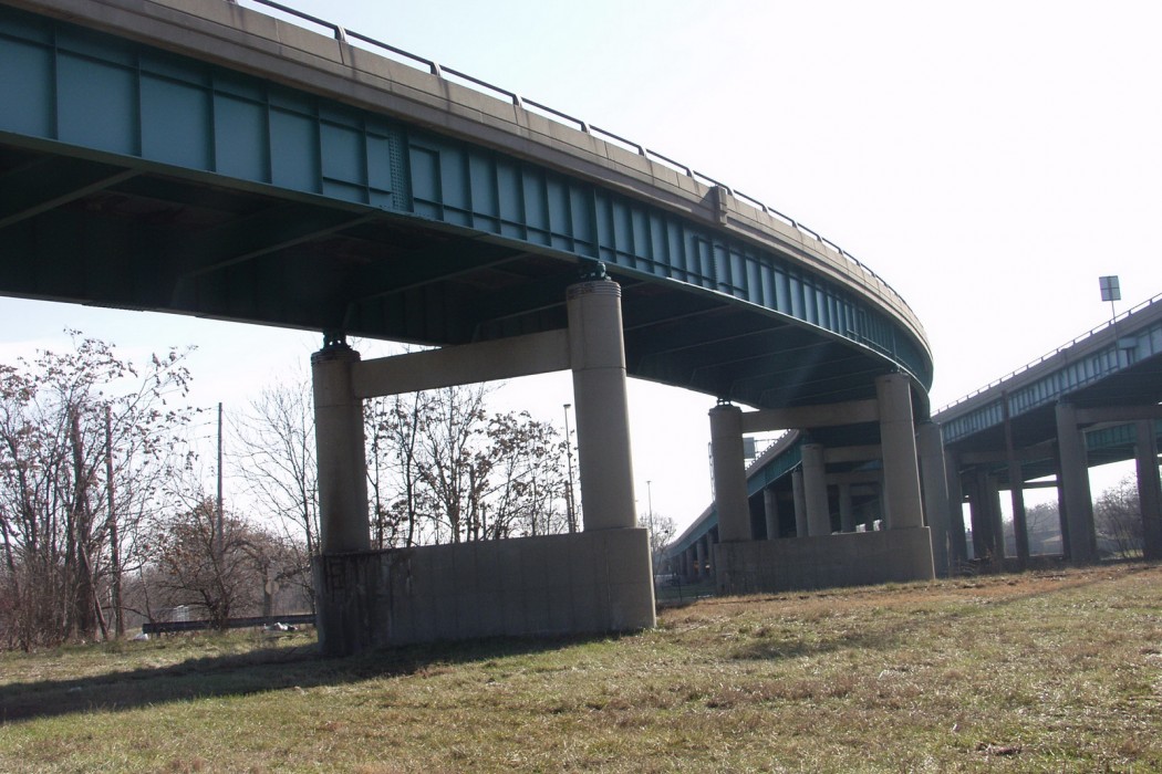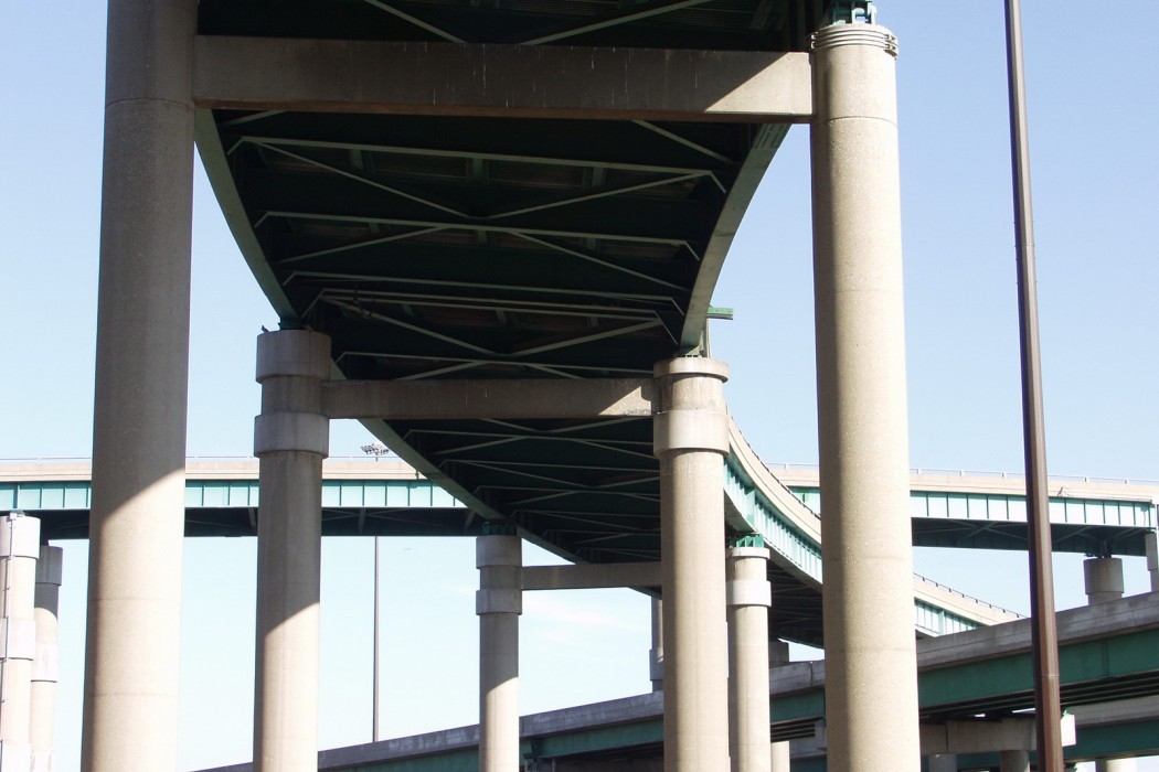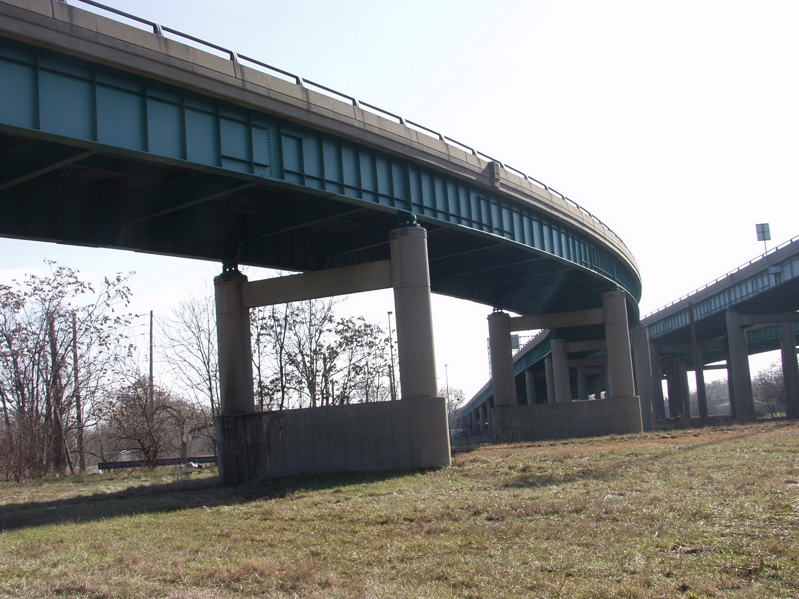 A system of elevated roadways connects the Poplar Street Bridge to several local, state, and interstate roads on the Illinois side of the Mississippi River. Built in the late 1960s, the elevated roadways feature concrete decks supported by steel beams and plate girders. Reinforced concrete columns founded on steel piles support the plate girders.