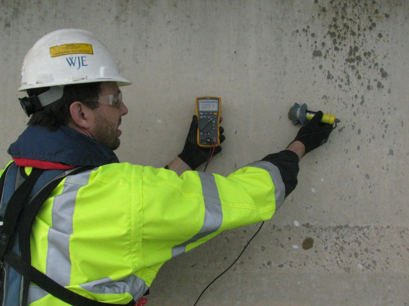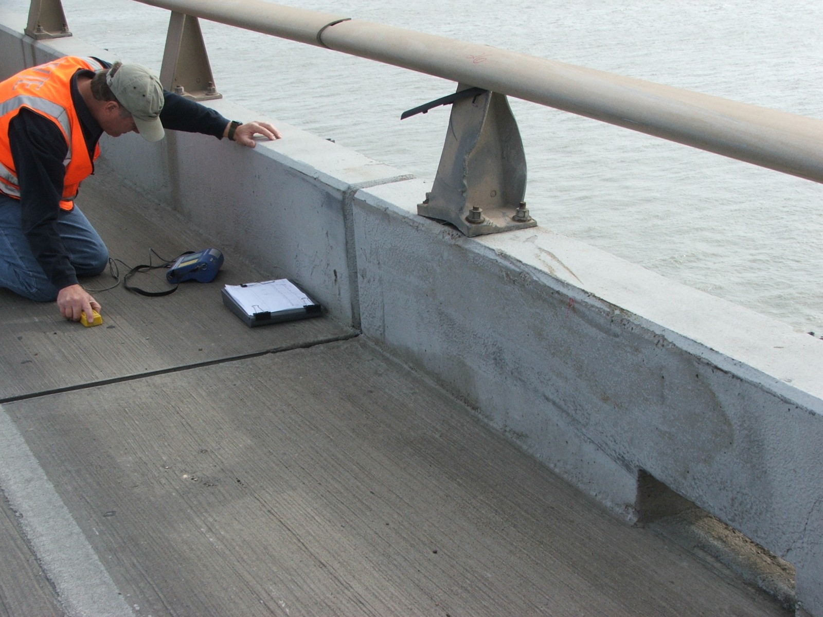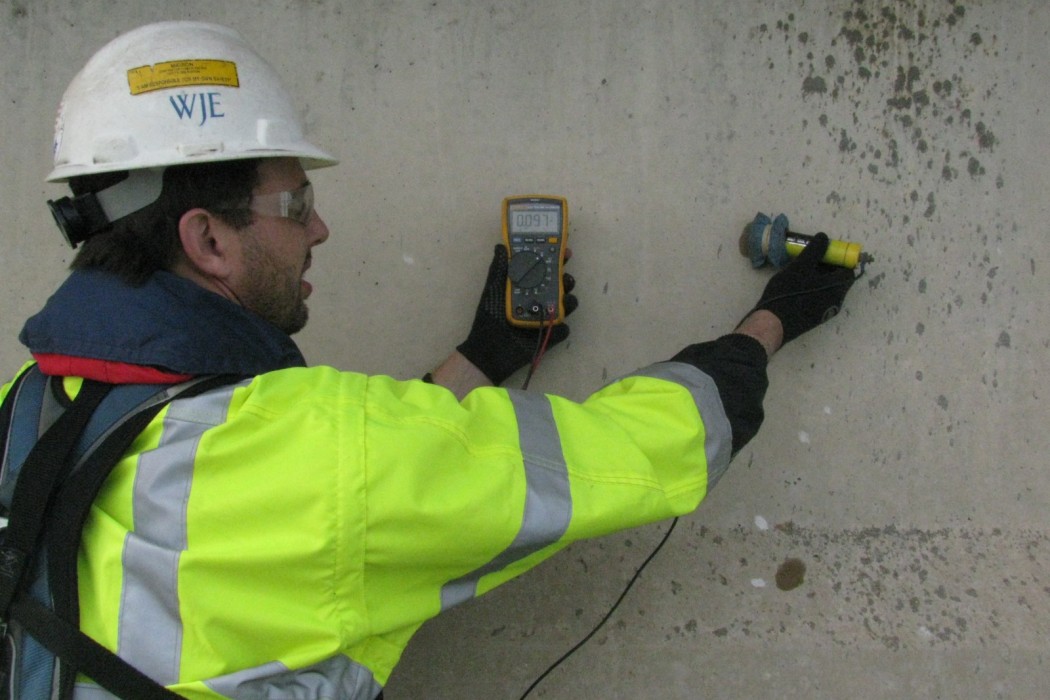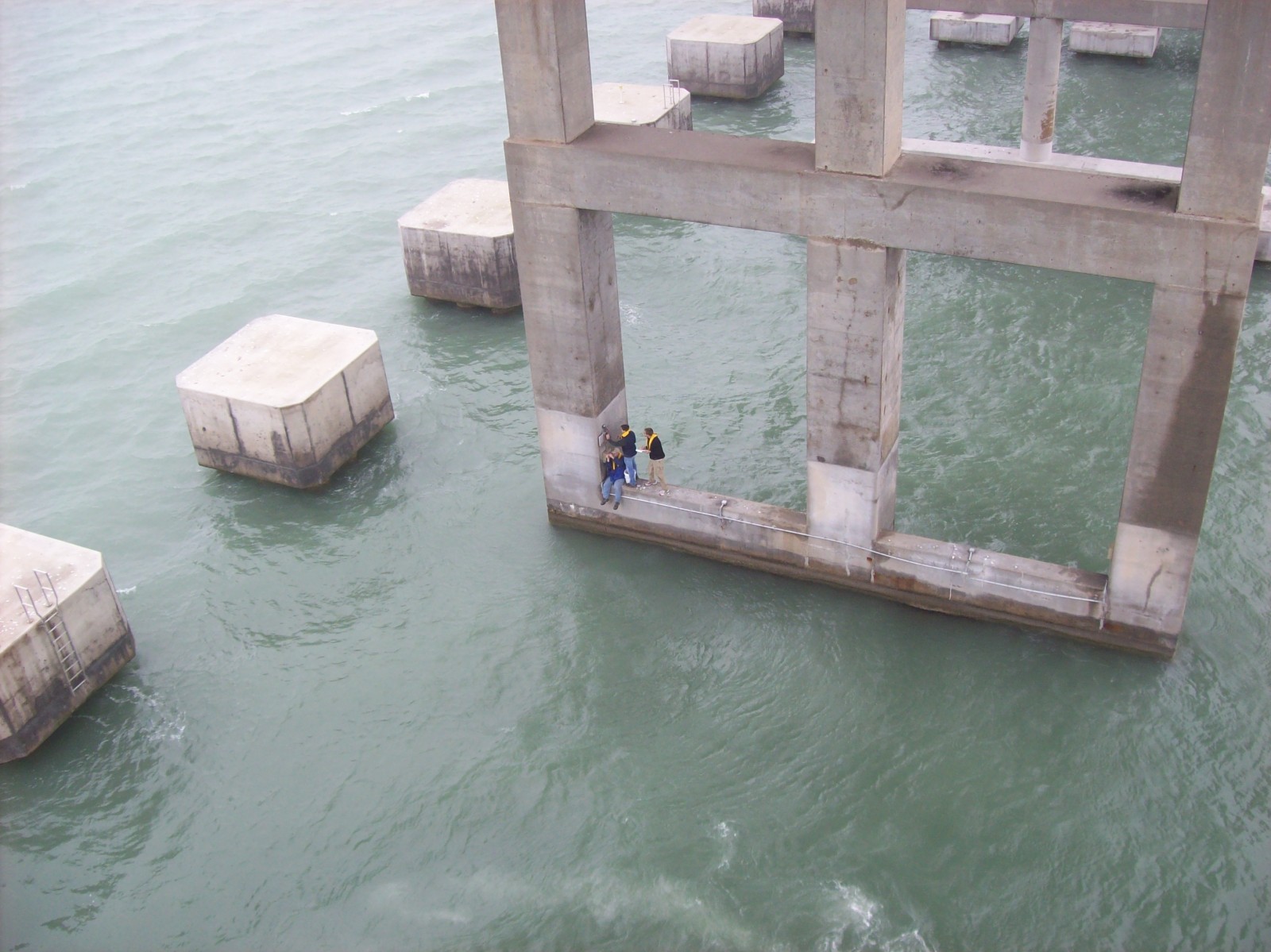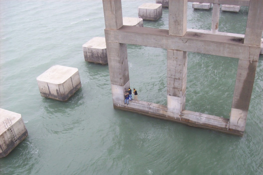 WJE engineers performed condition assessments of the causeway included comprehensive evaluation of fifteen pier sections (deck through pile caps) representative of various span lengths, height, and structural element types. Field testing included visual and mechanical sounding surveys, copper-copper sulfate half cell surveys for identifying active corrosion, corrosion rate assessments, rebar cover surveys, and assessment of cathodic protection systems. In-house laboratory evaluation of concrete material included chloride content, petrography, carbonation, rapid chloride ion penetrability, and compressive strength. WJE engineers also performed service life modeling to assess as-constructed service life and to aid in evaluating potential remediation and maintenance efforts for optimizing remaining service life. Final recommendations were based on the best-value maintenance and rehabilitation strategies to maximize the causeway's service life.