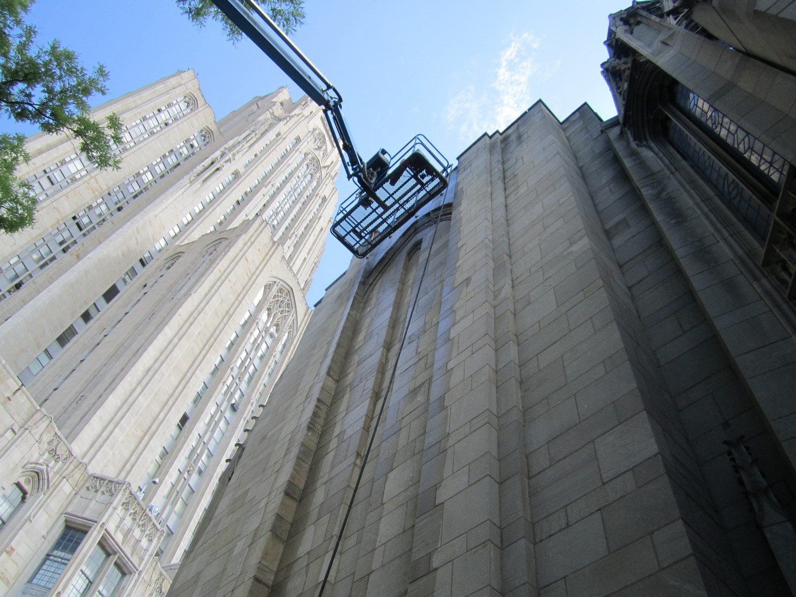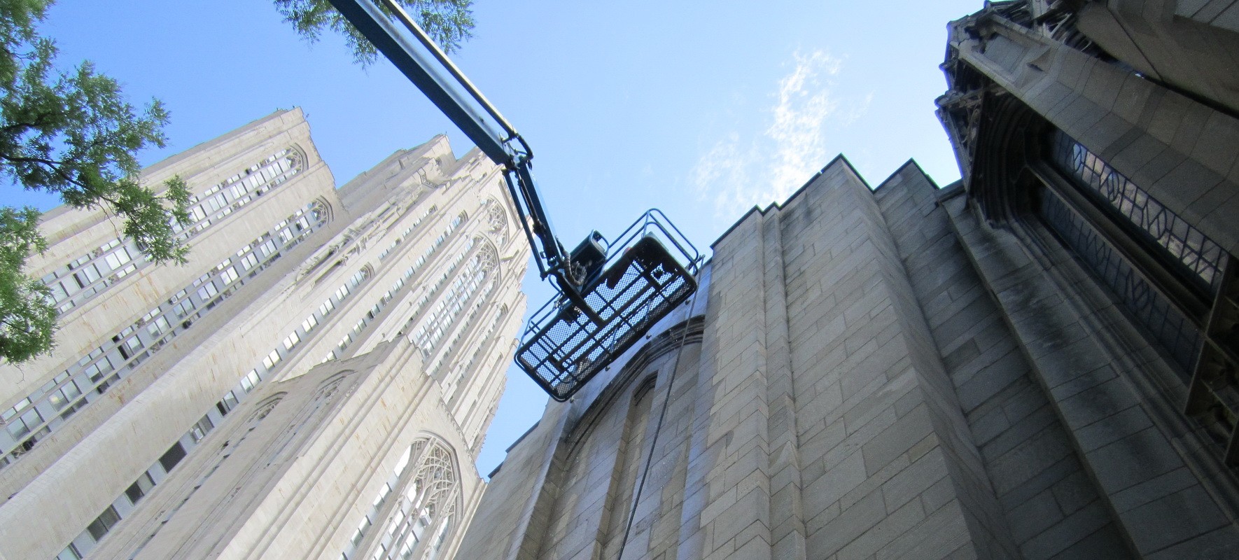 At the request of the University of Pittsburgh, WJE performed a water infiltration investigation of the Stephen Foster Memorial in Pittsburgh, Pennsylvania. The purpose of the investigation was to determine the cause(s) of water infiltration into the building interior at the north end of the building. The evaluation included a document review, visual condition surveys, infrared thermographic surveys, and water infiltration testing.