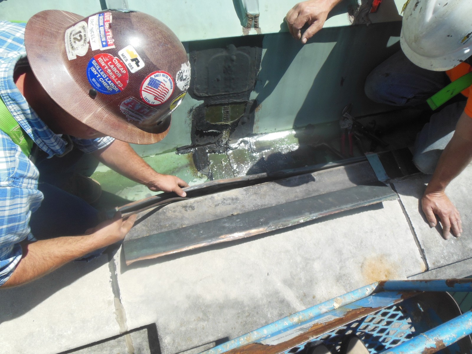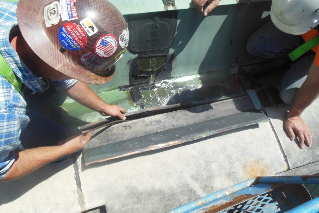 Flood testing was performed on the gutter system and the interior spaces were then monitored for water infiltration. Nozzle testing was performed to diagnose the ability for the lead flashing under the coping stones to drain. Spray rack testing was also performed across the exterior wall assemblies. Based upon observations from the visual condition survey and water infiltration testing, WJE selected a portion of the gutter on the west side of the building as a location to remove the various layers of the box gutter system for observation of the as-built construction of the gutter and condition of each layer.