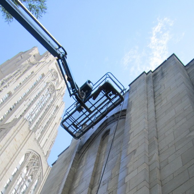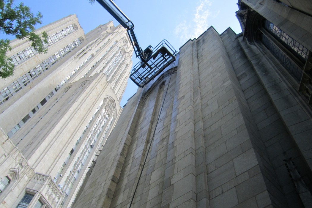 WJE performed a preliminary visual assessment of the building from interior spaces, accessible roof areas, exterior grade level, and an adjacent building. Additional visual assessment was completed from an aerial lift in conjunction with water infiltration testing. Prior to beginning the water infiltration testing, each test area was visually surveyed from the interior and exterior for conditions that may contribute to the water infiltration. Additionally, the interior walls and concrete roof slab were scanned with an infrared camera to confirm that areas near the testing locations were dry prior to testing.
