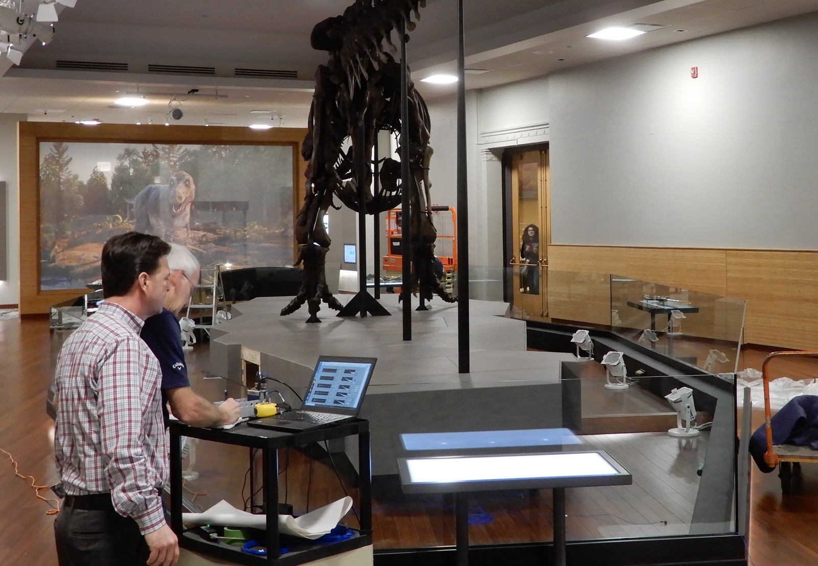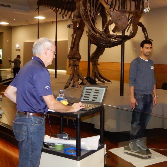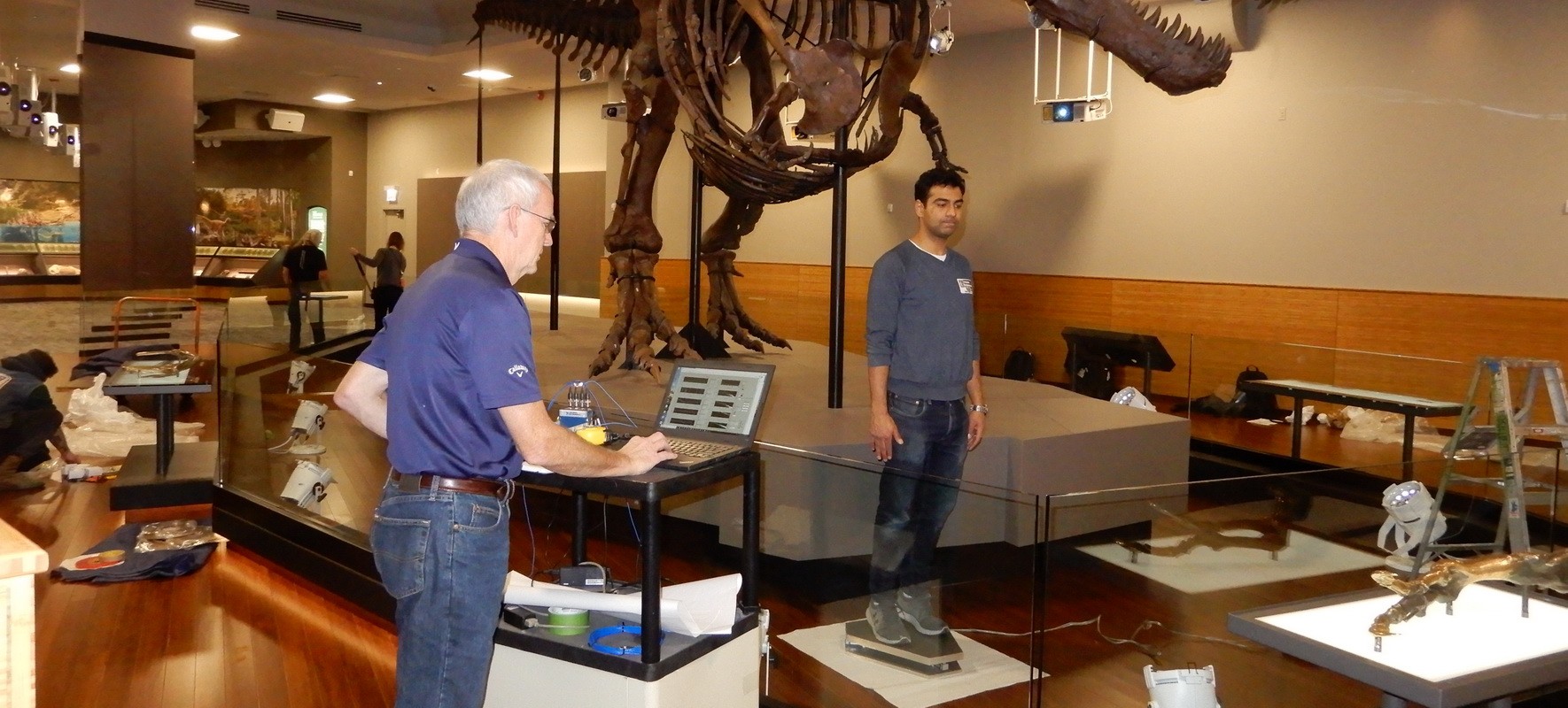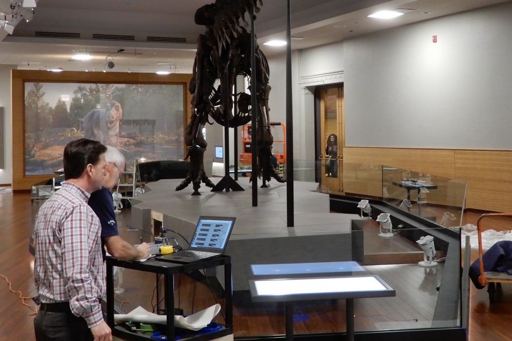 The Field Museum retained WJE to assess the vibration response as well as investigate, design, and assist with the installation of vibration mitigation measures at the new gallery floor for SUE, the Field Museum’s Tyrannosaurus rex specimen. Three general approaches were considered to reduce the footfall-induced vibrations that transmit though the floor: modifying the entire floor structure in the vicinity of the armature base, adding supplemental damping to the system, and isolating the armature base from the top of the concrete floor surface.