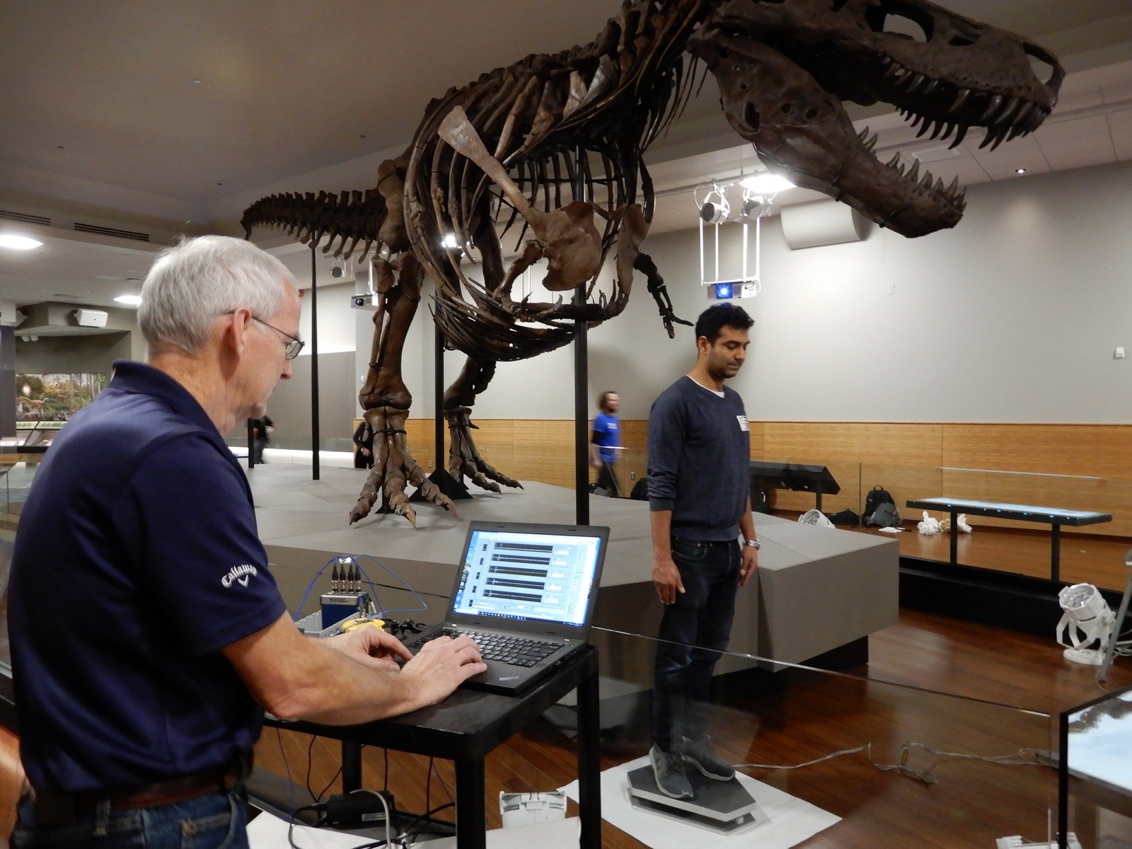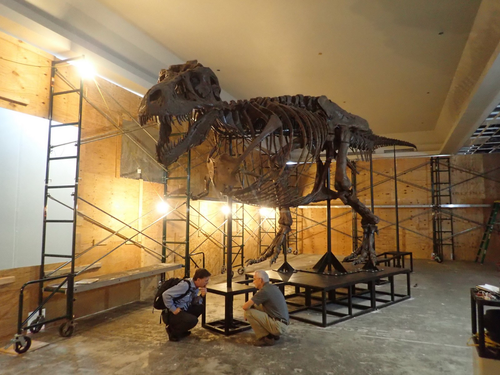 SUE and the accompanying steel-framed base, supporting posts, and armature that supports the fossils were moved from Stanley Field Hall, where the exhibit was located for eighteen years, to a new location on the second floor of the museum. The new gallery is located in a portion of the museum building that was originally a full-height, open-air light well. In 2002, the light well was infilled with three levels of steel-framed, lightweight concrete slab floors spanning 39 feet. The floor structure at the new location was reviewed for the weight of SUE, but during assembly of the skeleton, Field Museum staff noted concerns with respect to floor vibrations and accompanying dynamic response of the fossils.
